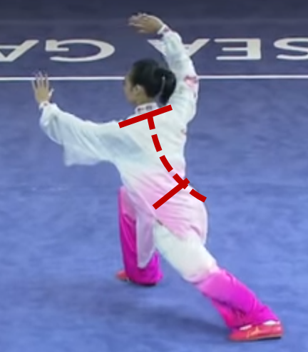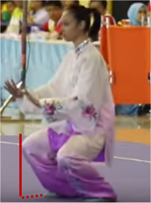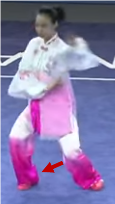 Açılış hareketine baktığımızda, videoda 0.26’daki çöküşün dizden yapıldığını ve bu yüzden dizin parmak ucunu fazlasıyla geçtiğini görüyoruz. İçsel prensiplere göre çöküş kalça ekleminin içine doğru yapılır ve diz bu şekilde ileriye gitmez. Dizden yapılan çöküş ve dizin ileriye gitmesi yerle güçlü bir bağlantı kurulmasını engeller, bu da karşıdan gelen gücün etkili bir şekilde yere aktarılmasına ve saldırılarda yerden etkili bir şekilde güç almaya engel olur.