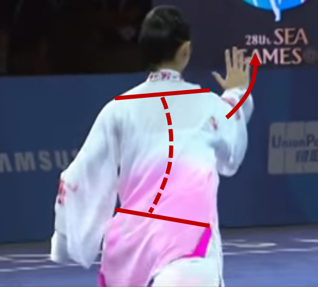 Yarışma videosunda dikkat çeken başka bir konu da el tekniklerinin ve tekmelerin beden tarafından yönetilmemesi ve bedenin geri kalanından izole olarak bağımsız hareket etmesi. Bunu bir çok yerde gözlemlemek mümkün, ancak net gösterebilmek için bedenin geri kalanının durduğu bölümleri örnek olarak alabiliriz. Videoda 0.53 0.55 arasında bedenin geri kalanı tamamen dururken kolların bağımsız olarak hareket edip açıldığını görüyoruz. Bu arada kullanılan duruş şekli de çok zorlu olduğu için, bu duruşta hareket etmek de daha zordur, ancak bu hakikati değiştirmez. İçsel Kung Fu'da el hareketinin vücuttaki hareket tarafından yönetilmesi gerekir. Bu olmadığında hareket istenen güce ve etkiye sahip olmaz.